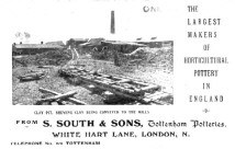 Nos. (1) - (4) comprise a series of postcards isssued by Samuel South & Sons in the 1920's (estimated). The South claim to be "The Largest Makers of Horticultural Pottery in England" seems to have been challenged and the cards are overprinted with "One of ......". Also, Tottenham Potteries usually referred to the neigbouring pottery of E. G. Cole. The South pottery was known as White Hart Lane Potteries. |
