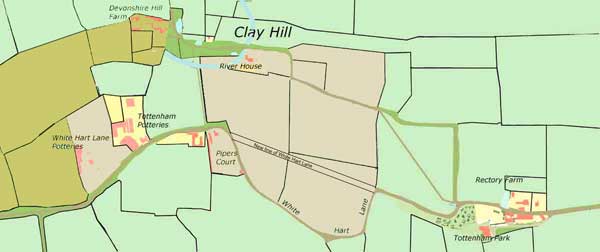 Examination of the Minutes of Tottenham and Wood Green Councils, the rating records for these two Districts, the 1910 Finance Act survey and the River House deeds, has established that, at the time his death in 1919, Samuel South(1) either owned or leased substantial parcels of land and properties adjacent to the boundaries of both Boroughs. The properties comprised the ownership of River House and Pipers Court and the lease of Devonshire Hill Farm from the New River Company together with the surrounding fields (42 acres) extending (off the map) westwards to the junction with Wolves Lane. The majority of the directly owned land (35 acres) was acquired by Tottenham Council in 1920 for the development of local authority housing (See Update No. 41). Certain of the leased land abutting the South pottery was purchased for future development of the pottery Continuing research into the history of the various land transactions is being undertaken at London Metropolitan Archives. |