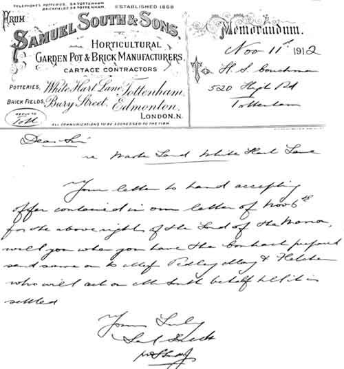 In 1909 Samuel South(1) purchased Pipers Court, a house and land situated to the south of White Hart Lane some 200 yards east from the South Pottery. Later, the house was to be occupied by his son, John South. By 1912, Samuel had also bought River House and 35 acres of adjoining land which extended to the original route of White Hart Lane (now Compton Crescent). Abutting this land, opposite Pipers Court, there was a small piece of manorial waste land which Samuel sought to include with his land holding. Approaches were made to Couchmans, the agents for the Lord of the Manor, who also acted, on other occasions, for Samuel South & Sons. Negotiations for the purchase were undertaken by Samuel(2) and an offer of £50 for the waste land was made. Research has discovered the papers relating to the sale and include a hand written letter of 11 November 1912 (see below) from Samuel(2) confirming acceptance of the offer and appointing Pedley, May & Fletcher, solicitors, to act |