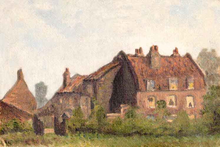 The potteries of Samuel South & Sons and E. G. Cole & Sons were developed on the site of Tent Farm, White Hart Lane, Tottenham (see the maps in Update no. 5). The farmhouse faced the lane and, later, became Tentdale, a pair of semi-detached houses. In 1891, Edward Cole lived at 1 Tentdale with his family and Samuel South(1) occupied 2 Tentdale with his wife, Alice, and eight of their ten children. His grandson, Jim South, has recalled ".....they lived in a house near Coles Pottery a place I well remember, causing me to wonder how they all got in there!" The houses were demolished in the late 1950's during the development of the Cole Pottery site. A painting of Tent farm remains in the possession of the Cole family and is reproduced above. The date is unknown but probably pre 1850. |