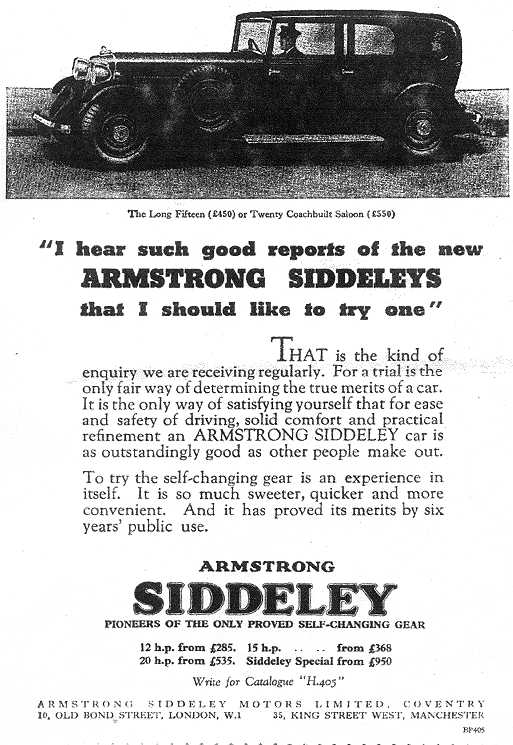 In the mid 1930's Samuel South(2) 1876-1956 purchased 20 hp Long Twenty Armstong Siddeley limousine, registration no. EMF 42. It was an impressive vehicle and many family members will recall special journeys in the car. An advertisement and review of the period are reproduced below followed by a review from "The Motor". |