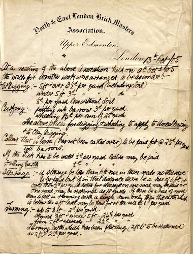 Joseph South(2) 1850-1897, the eldest son of Joseph South(1), leased a brickfield in Bury Street, Edmonton, adjacent the brick works of competitors, W D Cornish, W Piggott, T & M Plowman and Smyth & Co. Upon his death in 1897 the brickfield passed to his widow, Sarah, and by 1899 was under the management of his younger brother, Samuel South(1). The South brickworks closed circa 1914. During his presidential year Samuel South(2) addressed the Wood Green Rotary Club and a newspaper report appeared on 24 December 1937: "Forty years ago he [Samuel South(2)] was a member of the Brickmakers Association. At that time there were about twenty potteries [sic] around London; now there are about four. Members used to meet to discuss petty problems about men's overtime and other means of saving a few pennies. ' I used to make myself unpopular at these meetings but manged to stop the time wasting by proposing that we put a shilling on every thousand bricks. Better times were in store for the industry and the men after that' " The following minutes of a meeting of the Association in October 1905 are taken from a scrapbook kept by Samuel(2) (transcription beneath). |