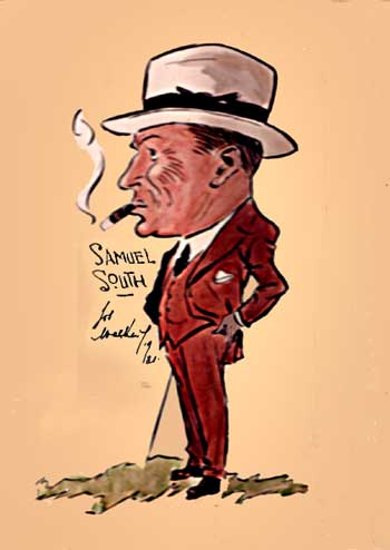 Caricature of Samuel South(2). It was drawn in 1931, when he was 55, by Joe Walker, official caricaturist for the weekly programme of Totteham Hotspur Football Club. Samuel(2) was a life-long supporter of the 'Spurs and purchased a £1 share, no. 1649, in the Club in 1903. |