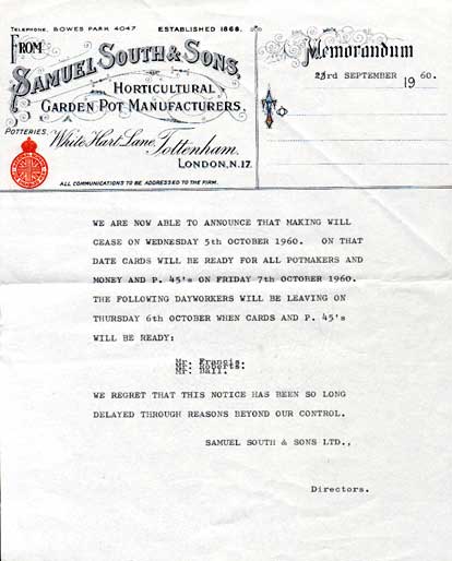 The Samuel South & Sons Potteries closed in 1960, the company and land was sold to Idris ltd. On 23 September 1960 a memo was circulated to the the remaining staff .