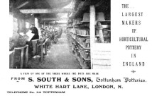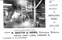Nos. (1) - (4) comprise a series of postcards isssued by Samuel South & Sons in the 1920's (estimated). The South claim to be "The Largest Makers of Horticultural Pottery in England" seems to have been challenged and the cards are overprinted with "One of ......". Also, Tottenham Potteries usually referred to the neigbouring pottery of E. G. Cole. The South pottery was known as White Hart Lane Potteries. |