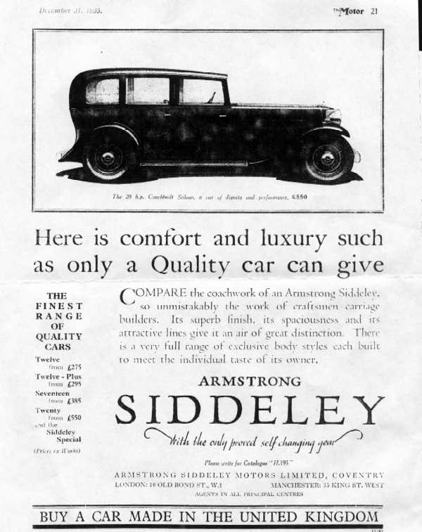 An enquiry was made with Brian Sewell (art critic of the London Evening Standard and occasional contributor describing classic cars). He identified the Armstrong Siddeley bought by Samuel(2) (Update No 8) as " ...a 'Twenty' of 1934 or thereabouts. Small Armstrongs were every bit as good as 'small Daimlers - a little less expensive but not much......". The address of the Armstrong Siddeley Owners Cub was provided and they have supplied a copy an advertisement that appeared in 'The Motor' magazine on December 31, 1935.