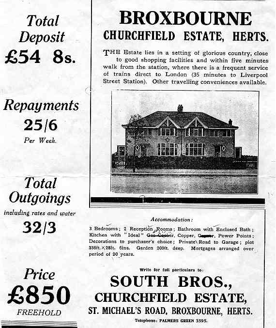 Doris South - daughter of Walter South (second son of Samuel(1)) - has kindly donated a copy of the advertisement for the small development (four pairs of semi-detached houses) undertaken by South Brothers in Broxbourne and mentioned in Update No 13.