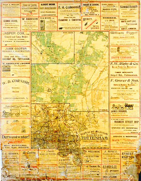 The business map comprises a wall chart, 3' x 2' 6" (approx.), displaying maps of Tottenham & Wood Green surrounded by advertisements for 36 local businesses including Samuel South & Sons (No. 36). The advertisements include delightful phrases as "We do not tear your linen" - Beresford Excel Laundry (No. 15) - see Transcription. The lower edge of the chart has deteriorated and parts of the advertisements are indecipherable. The map has been donated to Bruce Castle Museum, Tottenham. |